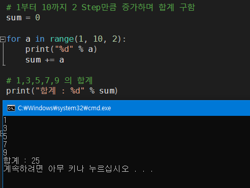 for 변수 in range(시작값, 종료값, 증가 또는 감소분 Step):
