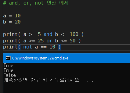 | 조건1 and 조건2 | 조건1 과 조건2 가 둘다 참이어야 결과가 참 |