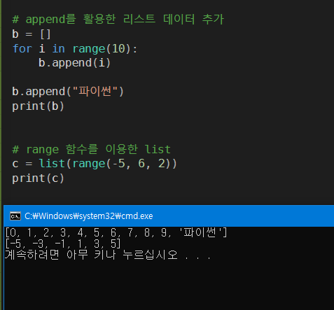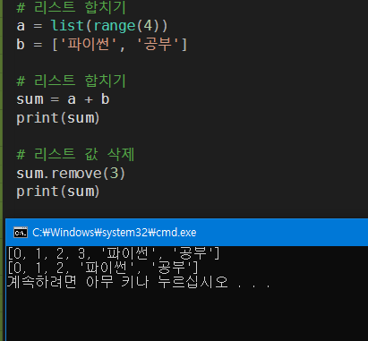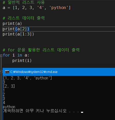 리스트(List) : 여러개의 값을 담을 수 있는 컨테이너로 숫자, 문자 등을 결합해서 담을 수 있다. c언어 list 와 유사하다