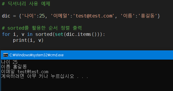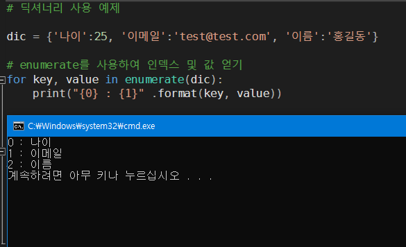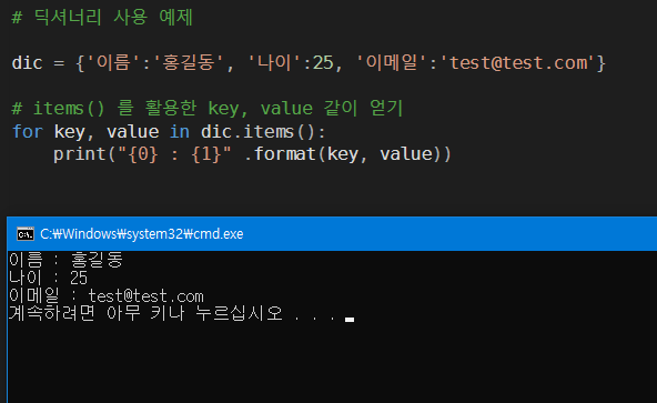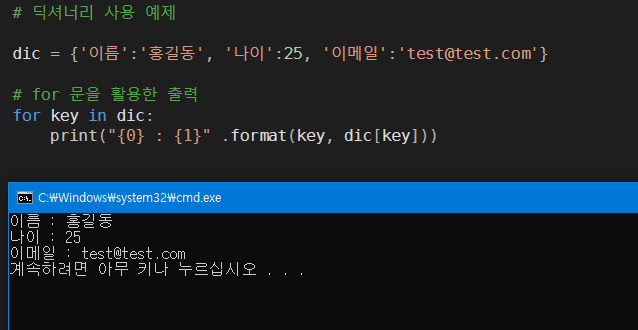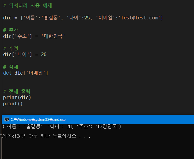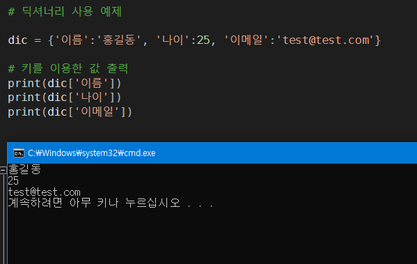 딕셔너리 : 인덱스 '키' 와 자료 내용인 '값'을 이용하는 컨테이너, c언어 map 과 비슷하다