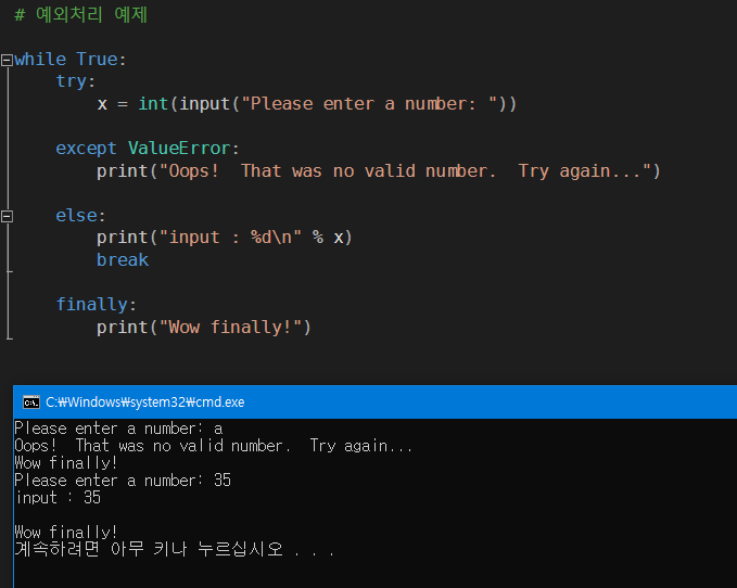 x 변수에 int형으로 입력받는 값을 try - except로 체크하면서 입력받은 자료형이 int가 아닌 경우 ValueError 오류 핸들러로 예외처리가 되며, int형으로 입력된 경우 else 구문을 실행하게 되며 while구문이 종료 처리 됩니다. finally 구문은 항상 실행됩니다.
