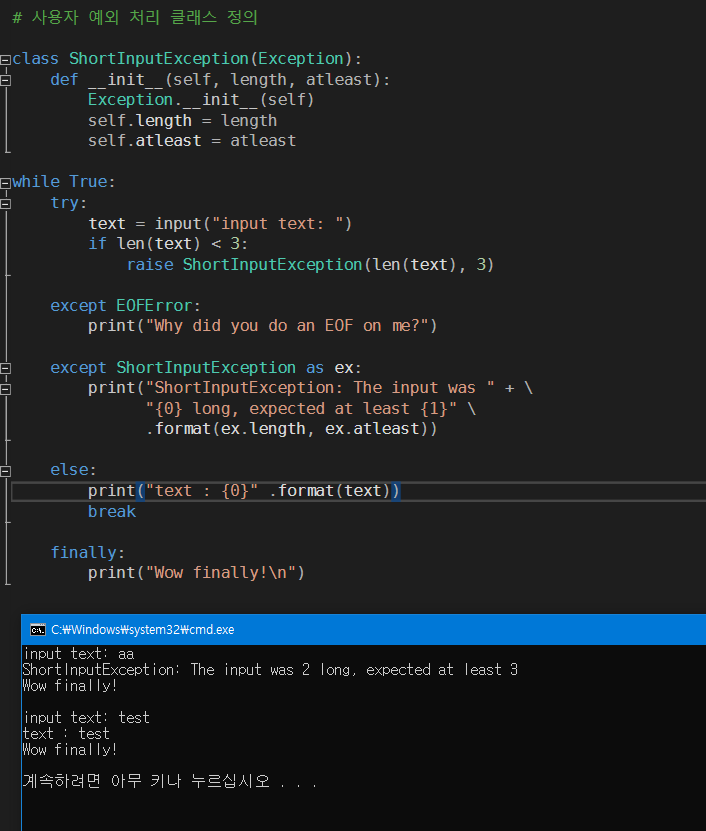 입력받은 글자수의 길이를 체크하여 3 미만일 경우 사용자 예외 처리로 raise 하게되면 except로 throw 하게됩니다.