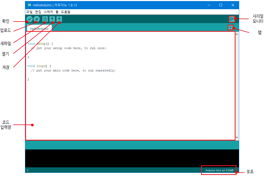 ■ 확인 (Verify) : 코드를 보드에 보내기 전에 보드가 이해할 수 있도록 명령어를 변경합니다