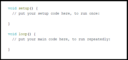 아두이노 프로그래밍은 기본 c언어를 기반으로 작성되며, 2가지의 기본 함수 setup() 와 loop() 함수로 구성됩니다.