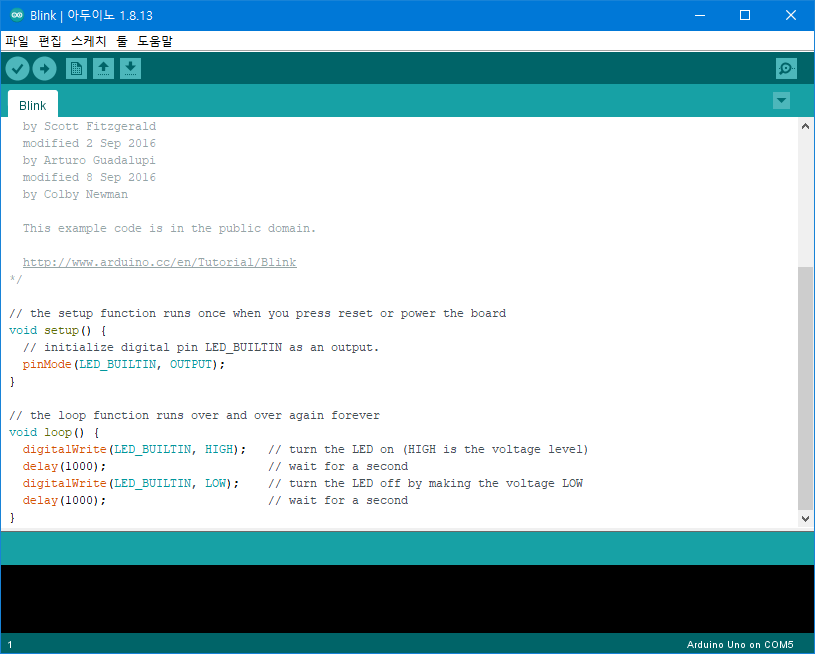 아두이노 IDE를 실행하고, LED blink 예제를 불러옵니다. (파일 > 예제 > 1.Basics > Blink)