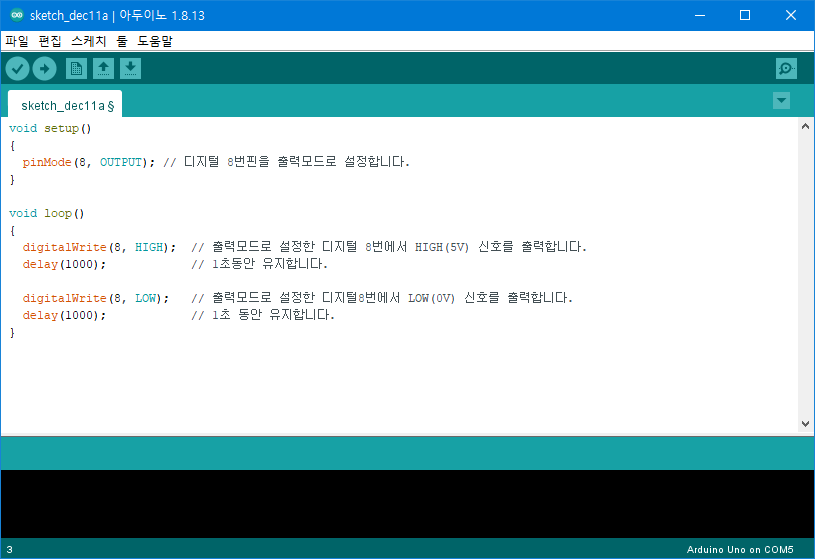 ※ 사용된 코드 알아보기pinMode(핀번호, 출력모드지정) : 출력모드는 OUTPUT(출력) 또는 INPUT(입력)으로 모드를 설정합니다. digitalWrite(핀번호, 신호값) : 신호값은 HIGH(5V) 또는 LOW(0V) 를 입력하여 신호를 보냅니다. delay(시간 ms) : 설정 시간만큼 딜레이를 줍니다. 1000당 1초 ms입니다. |