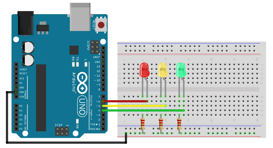 아두이노 보드, 필요한 것은 220옴 저항 3개, LED 3개, 점프선 입니다.