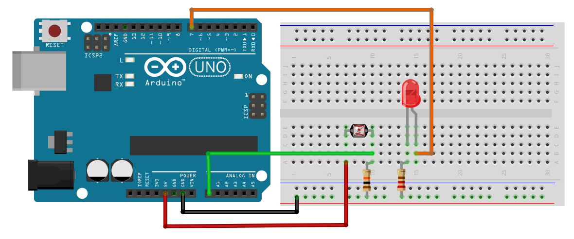 구성 : 아두이노 보드, LED x 1 , 220Ω x 1, 조도센서 x 1, 10KΩ x 1, 점프선 등