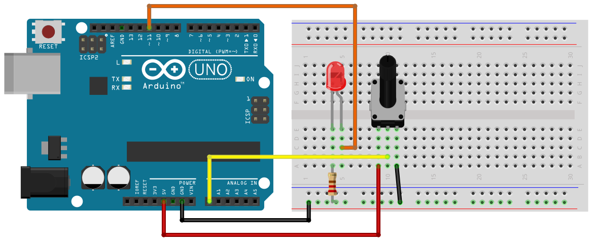 아두이노 우노 보드, LED x 1, 220Ω x 1 가변저항 x 1, 점프선 등