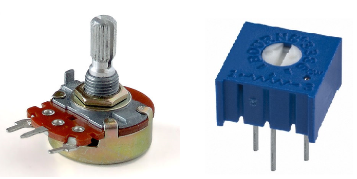 가변저항(Potentiometer) : 가변저항은 저항을 임의로 바꿀 수 있는 저항기를 말합니다. 가변저항기로 저항을 바꾸게되면 전류의 크기도 바뀌게 됩니다. 대표적인 예로 라디오의 볼륨조절기나 전압조절기 같은 것을 볼 수 있습니다.