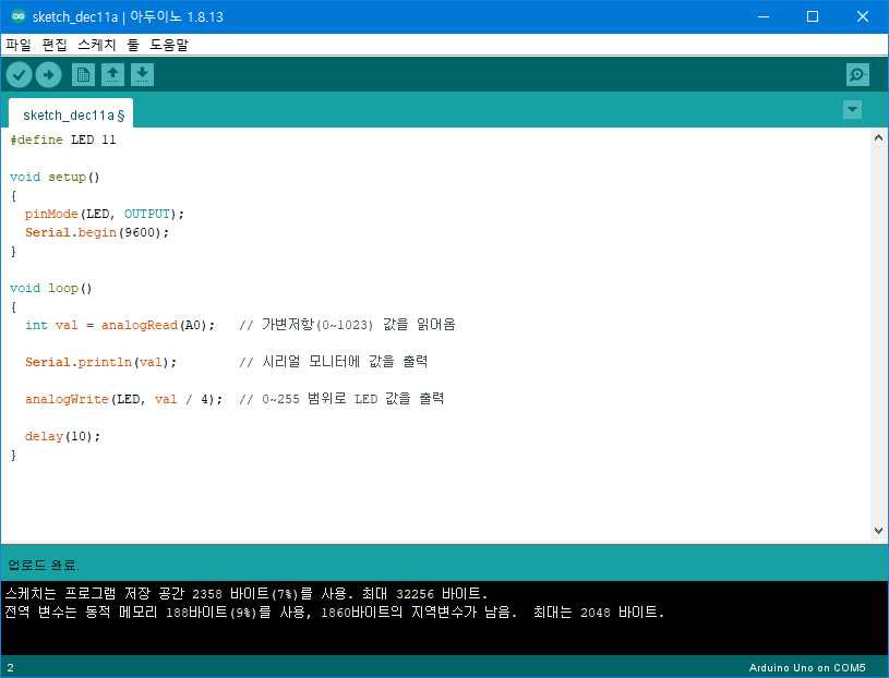 본 예제는 가변저항을 이용하여 LED 불빛 세기를 조절하는 것을 구현하도록 하였습니다.