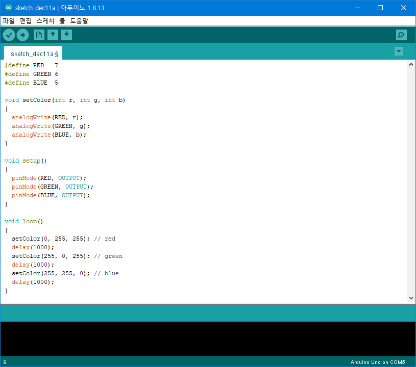 다음 코드에서는 순차적으로 빨강, 녹색, 파랑 색상이 1초 간격으로 반복 표시되도록 하였습니다.