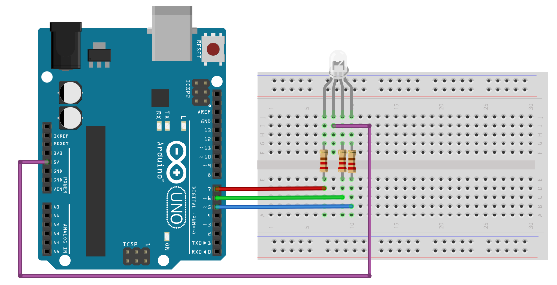아두이노 우노 보드, RGB LED x 1, 220Ω 저항 x 3, 점프선 등