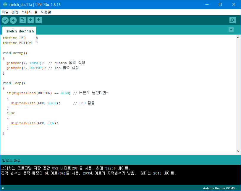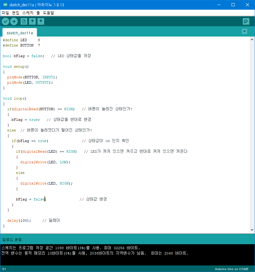 버튼이 눌러진 상태값을 확인해서 LED가 켜진 상태에 따라 켜짐, 꺼짐을 반복하게 됩니다.