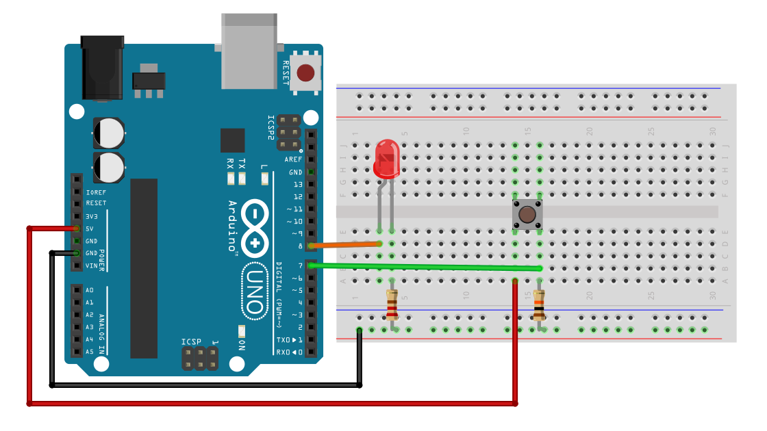 푸시버튼 회로에서 버튼의 GND 회로 사이에 10kΩ 저항을 연결하게 됩니다. 이는 아두이노의 전원이 쇼트되는 것을 방지하는 목적으로 구성합니다.