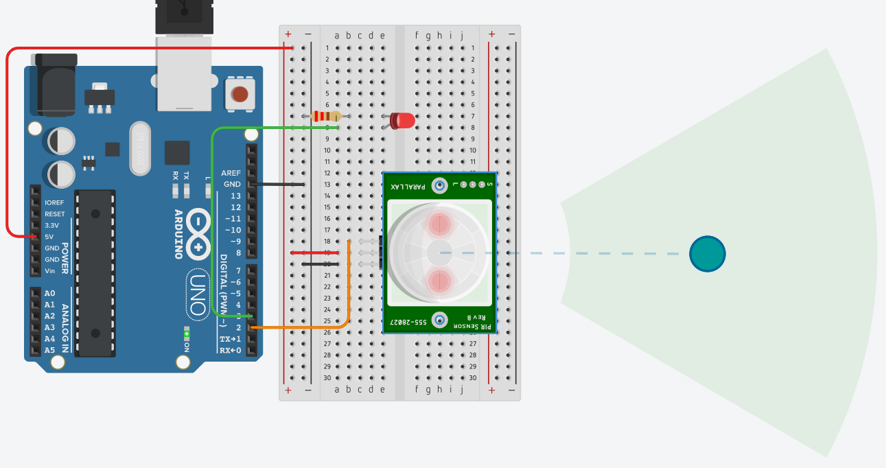 준비물 : 아두이노 우노, 브레드보드, 220Ω 저항 x 1, LED x 1, PIR 센서, 점프선 등
