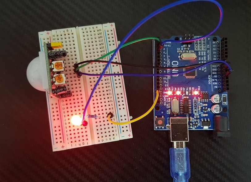 본 예제는 PIR 센서에 적외선 움직임이 감지되면 LED가 점등되며, 시리얼모니터에 그 값을 출력하도록 구성하였습니다.
