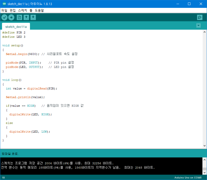 PIR 센서값을 읽어서 HIGH 인지 비교하여 HIGH이면 움직임이 감지되었다는 것이므로 LED를 점등합니다.