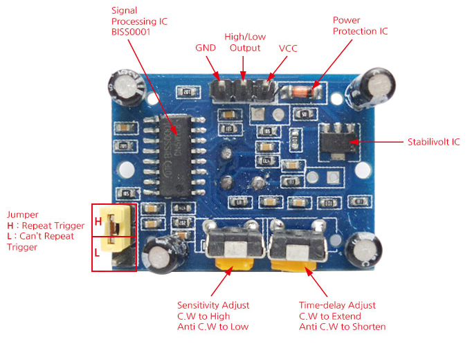 출력 방법 : 움직임이 감지되면 3V 의 HIGH 디지털 신호를 출력하며, 미감지시 LOW가 출력됩니다. 또한 신호 출력 길이는 센서마다 다르며 PCB의 저항과 콘덴서로 결정됩니다.