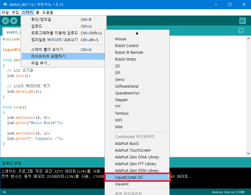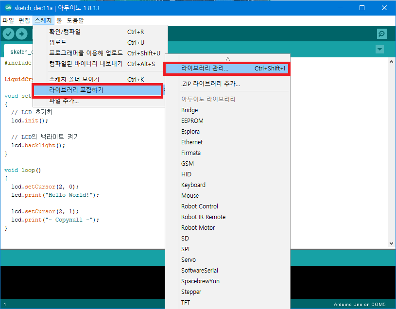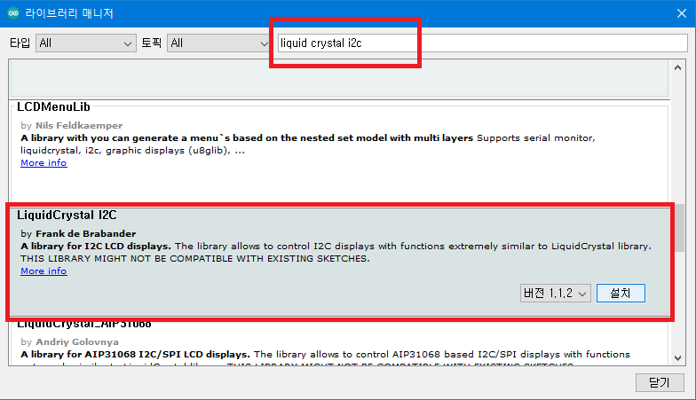 I2C LCD 모듈을 이용하기 위해 추가적인 라이브러리 설치가 필요합니다.