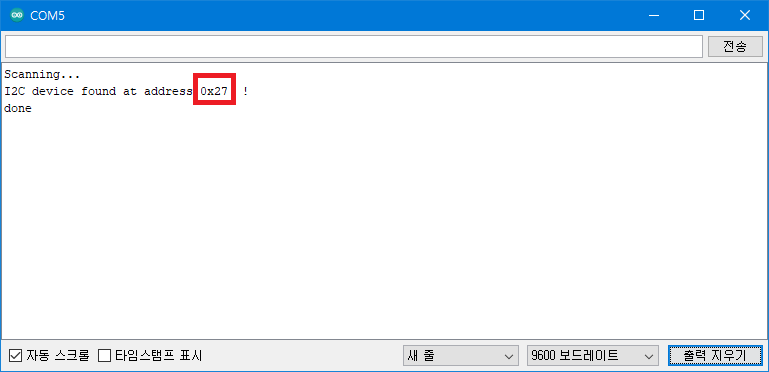 아두이노와 LCD모듈을 연결한 상태에서 아두이노 코드 빈 프로젝트를 띄운 다음 이곳에서 I2C Scanner 코드를 복사하여 붙혀넣고 실행하시면 시리얼모니터를 통해서 자신의 채널값을 확인 할 수 있습니다.
