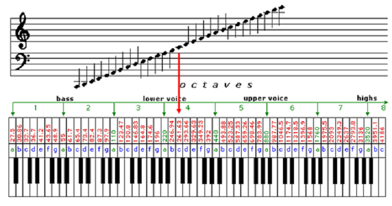 높은 음자리표에서 기본 음계인 ‘도’는 진동수가 261.63Hz(헤르츠)입니다. 1Hz가 1초에 1번 진동하는 것을 의미하기 때문에 ‘도’를 표현하기 위해 대략 262번 떨림이 발생합니다.