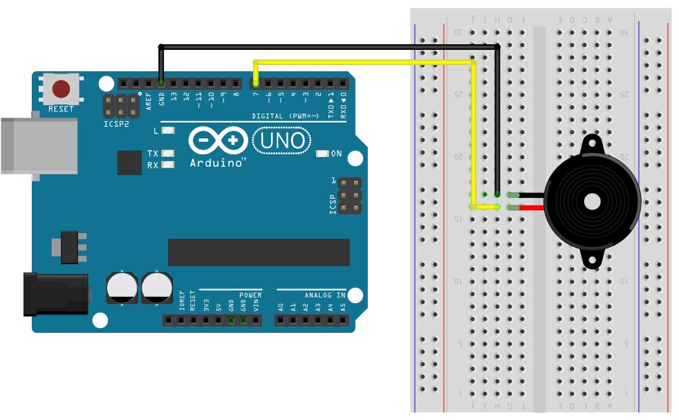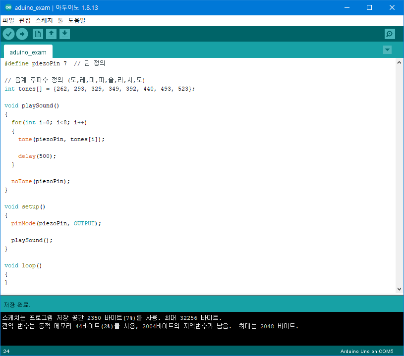 피에조 부저를 사용하여 '도 레 미 파 솔 라 시 도' 를 소리내도록 예제를 구성해봅시다.