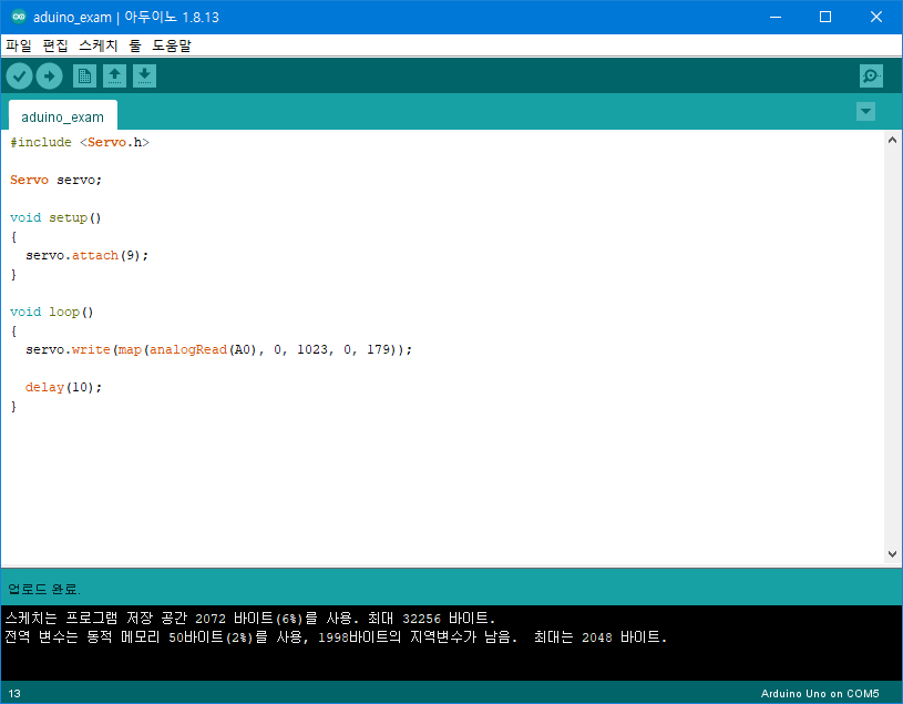 가변저항을 통해 저항값의 범위를 180도로 제어하기 위해 1024의 범위를 180으로 mapping 변경하여 서보모터에 값을 전달하여 각도를 조절합니다.