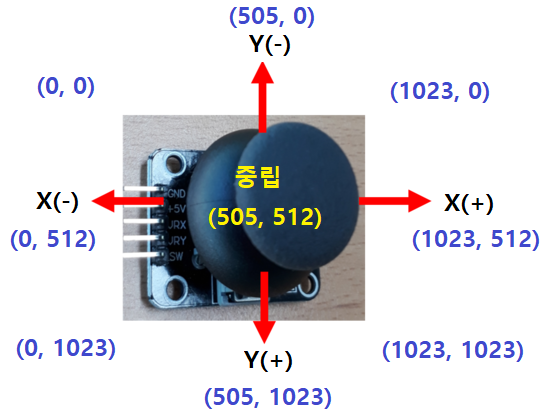 조이스틱 모듈은 5v, GND, x, y, sw 5개의 핀으로 구성되며, 좌표는 위와 같습니다.