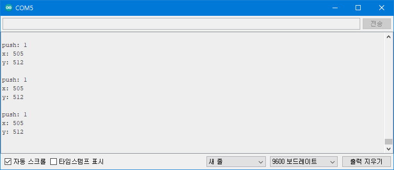 x, y 좌표는 아날로그 신호로 출력되며, 푸시버튼의 경우 디지털 신호를 출력합니다.