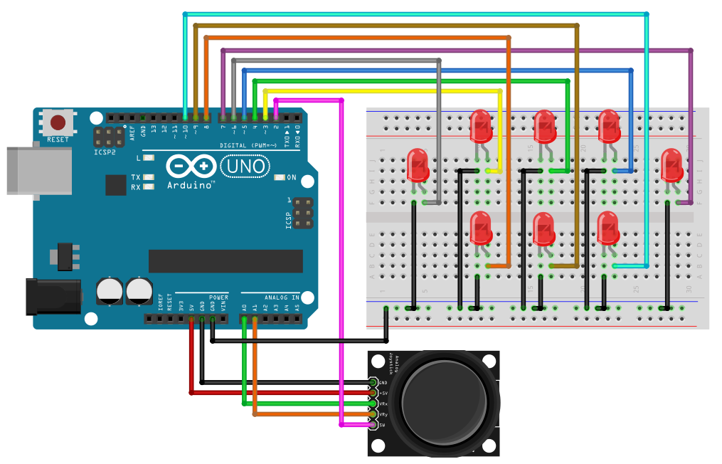 아두이노보드, LED 8개, 점프선, 조이스틱버튼 등