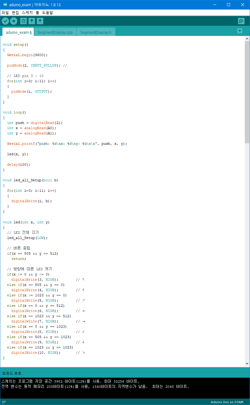 본 예제에서는 8개의 방향을 감지하여 LED로 표시해주는 예제입니다. 푸시버튼 예제는 따로 출력하지 않고 시리얼모니터를 통해서 출력하도록 하였습니다.