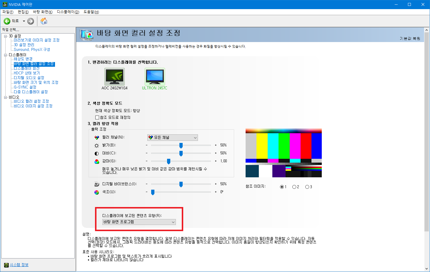 'nvidia 제어판 - 바탕화면 컬러 설정 조정 - 디스플레이에 보고된 컨텐츠유형' 항목을 바탕화면 프로그램으로 변경합니다.