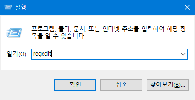 '윈도우키 + R' 을 눌러서 'regedit' 입력하여 레지스트리 편집기를 엽니다.