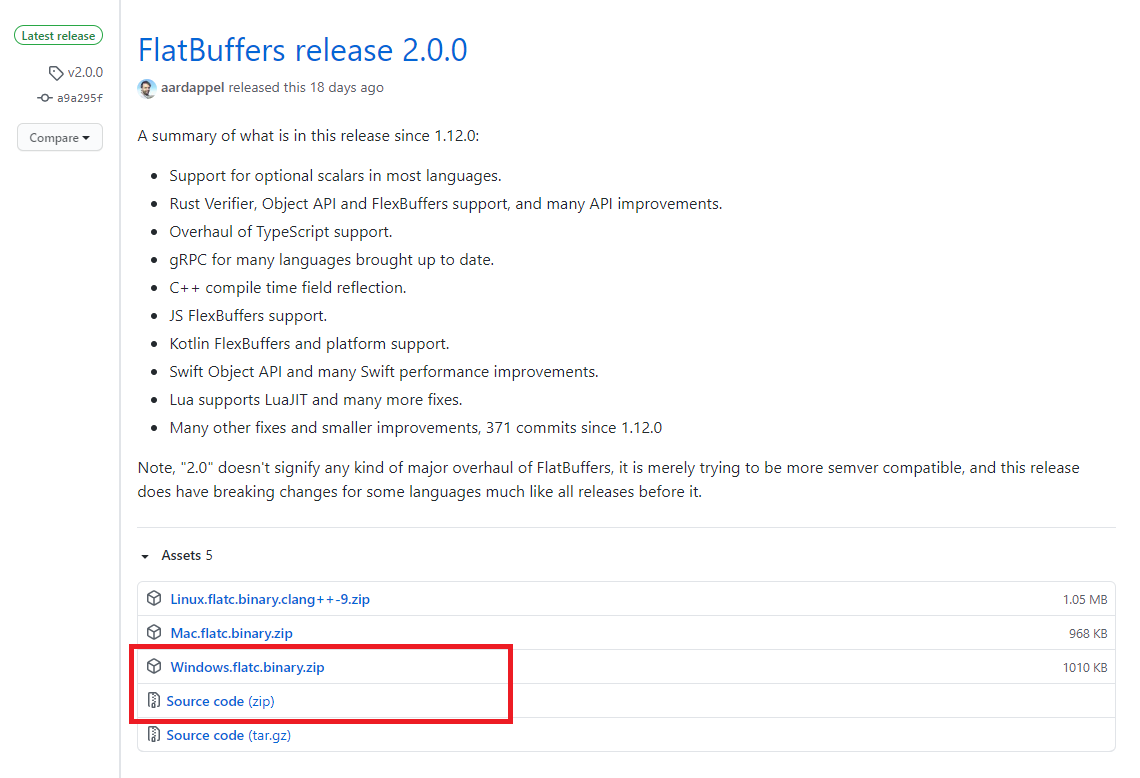위 사이트로 이동하여 아래와 같이 windows.flatc.binary.zip 그리고 source code (zip) 을 다운로드 해줍시다.