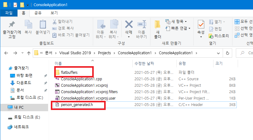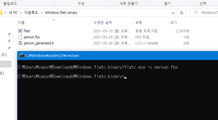 파일명을 person.fbs 로 저장합니다. 그리고 flatc.exe와 같은 폴더에 넣습니다.