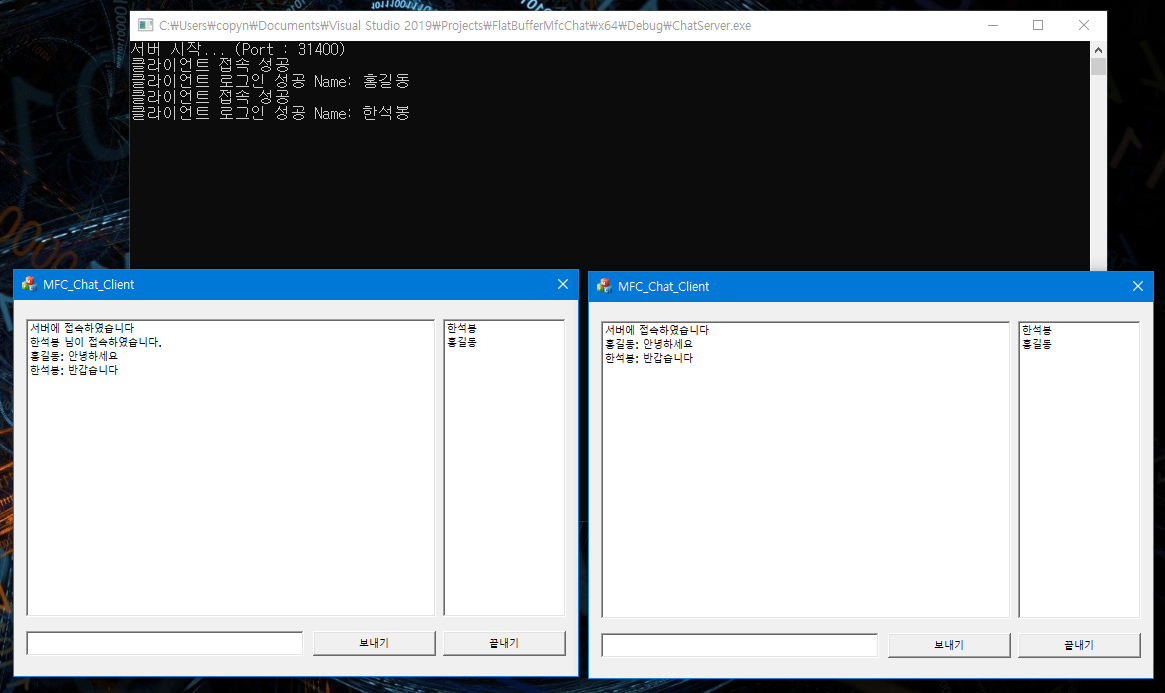 기본적인 구조는 콘솔 서버와 같습니다. 클라이언트의 경우 유저 목록을 받아오는 @_USER_LIST_@ 패킷 프로토콜이 추가 되었습니다.