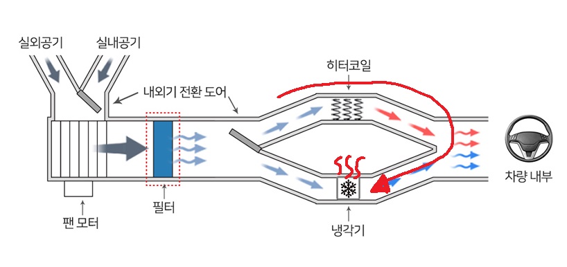 사실 이 원리는 히터코일에서 뜨거워진 공기를 에바 냉각기쪽으로 보내서 뜨거운 공기로 맺혀진 물기를 말려주는것과 동시에 살균소독으로 곰팡이균을 죽여버리는 방법인데요.
