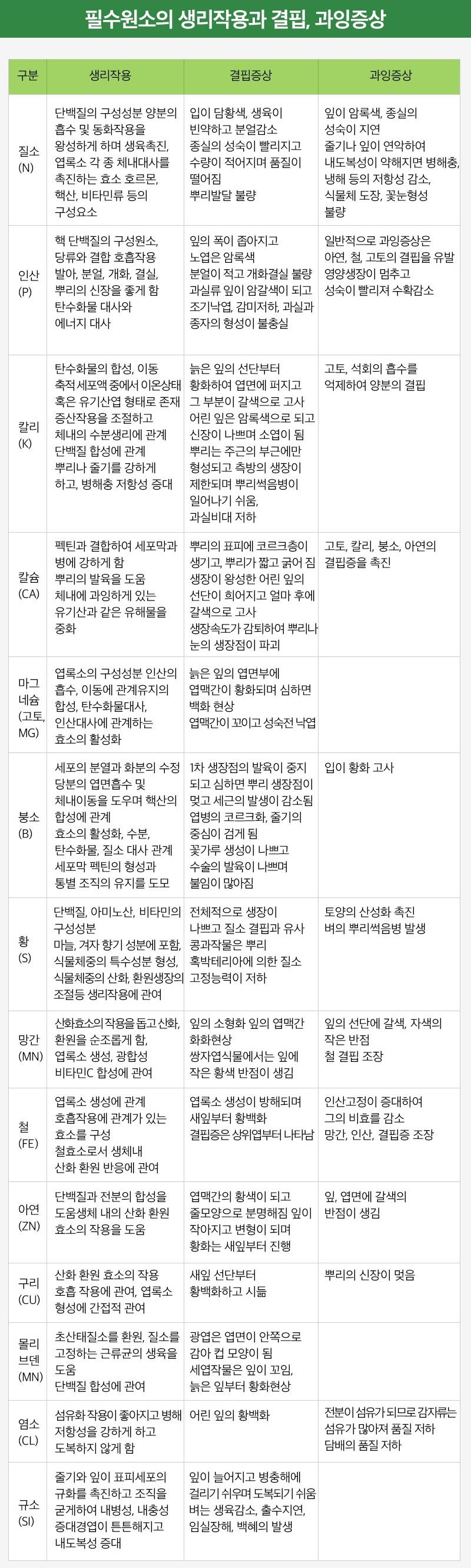 [농업] 비료 필수 원소의 생리작용과 결핍 및 과잉 증상