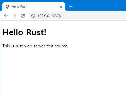 웹 브라우저를 열고 아까와 같이 127.0.0.1:7878 로 접속해보세요, 여러분이 작성한 hello.html이 브라우저에 나타날 것입니다.!