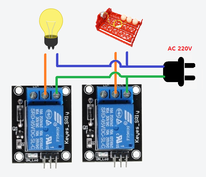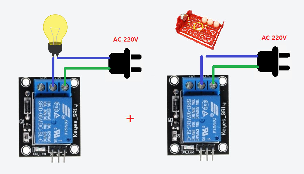 자 아래와 같이 전구와 전란기를 각각 릴레이를 사용하여 아두이노에서 제어할 수 있습니다.