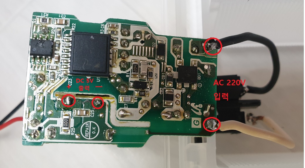 (1) 5V USB 어뎁터 분해 및 회로 배선 구성