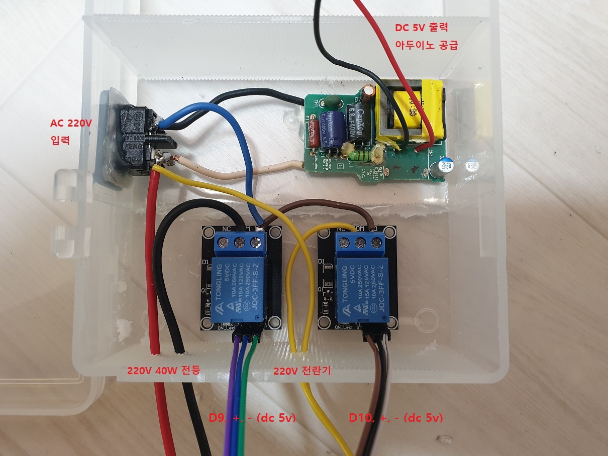 아두이노는 5v를 사용하기 때문에 안정적으로 공급하기 위해서 usb 5v 어뎁터를 활용하였으며, 220v 릴레이를 통한 전등 및 전란기 제어를 구성하였습니다.