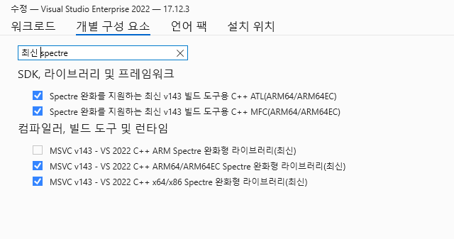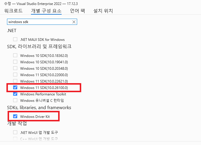 1. 먼저 Visual Studio Installer 를 실행하고 개별 구성 요소 항목에서 Windows SDK (10.0.26100) 와 Windows Driver Kit 을 설치합니다.
