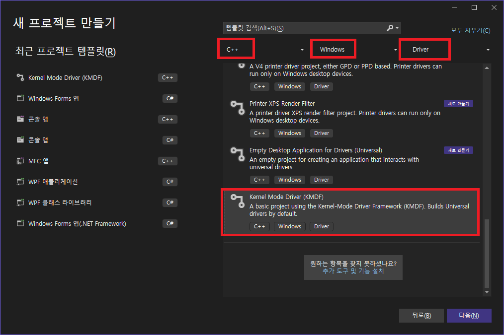 4. Visual Studio 2022를 실행하고 새 프로젝트 생성을 선택하면 아래와 같이 driver 항목이 나오고 WDK 설치 항목들이 나온다면 정상적으로 설치가 된 것입니다.