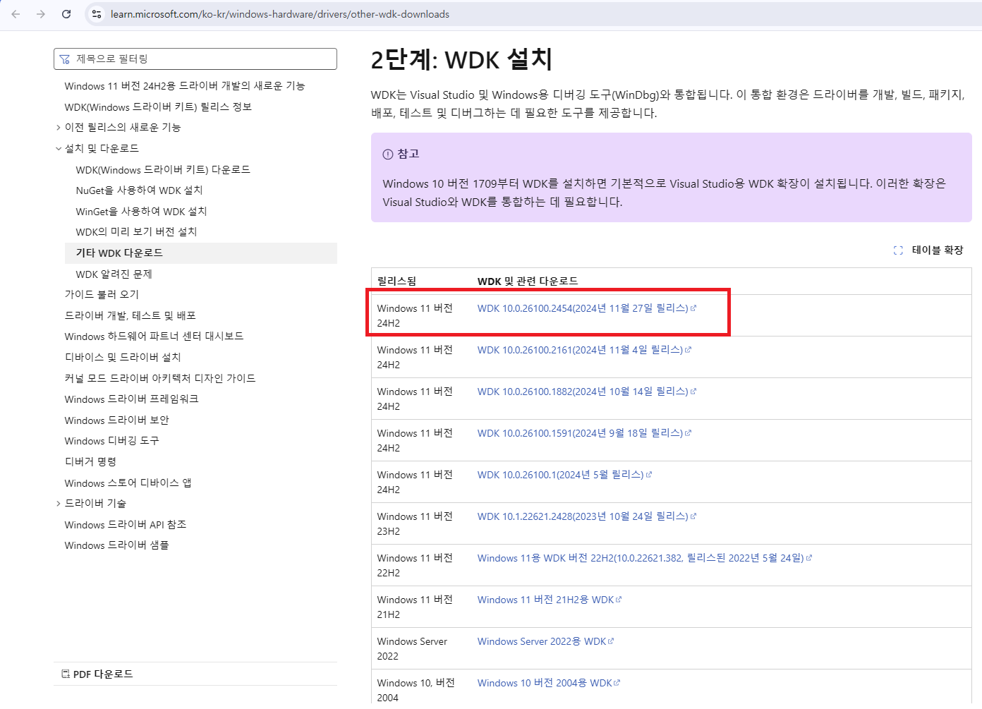WDK(Windows 드라이버 키트), Windows 디버거(WinDBG) 등의 버전을 설치합니다.