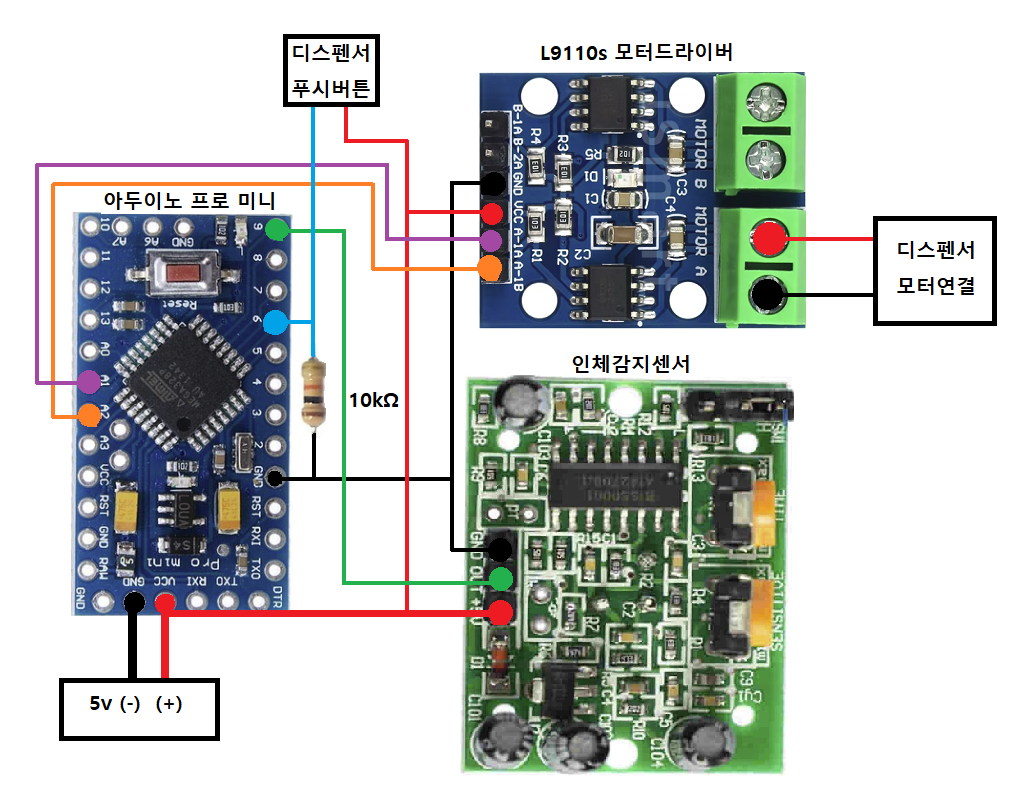 | 아두이노 프로 미니 | L9110S 모터 드라이버 | 인체감지센서 |